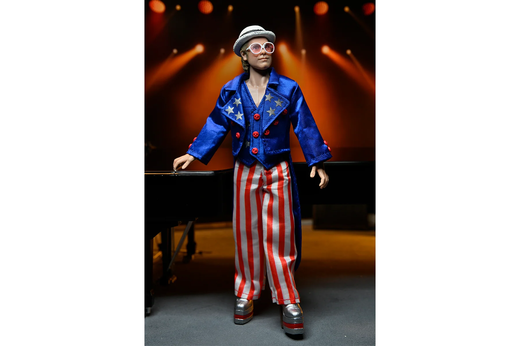 In partnership with Elton John, NECA has produced a second deluxe tribute to the legend and his profound influence on both music and fashion. The Elton John Live in ‘76 action figure set stands 8 inches (20.3 cm) tall and features the legend in his patriotic best: a shimmering coat-tail tuxedo resplendent in red, white, and blue.